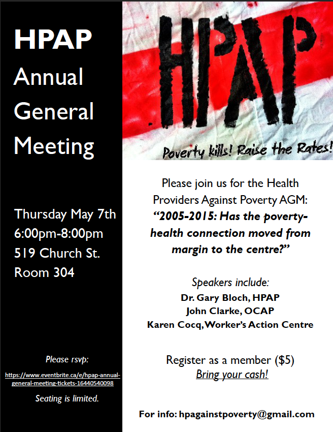 Categories HPAP Ontario HPAP Annual General Meeting May 2015 Post author By Health Providers Against Poverty Post date April 20, 2015 Share this: Click to share on X (Opens in new window) X Click to share on Facebook (Opens in new window) Facebook Related Tags 2015, AGM ← Editorial: Are Sick Day Policies Making Us Sicker? → Press Release: 2015 Ontario Budget