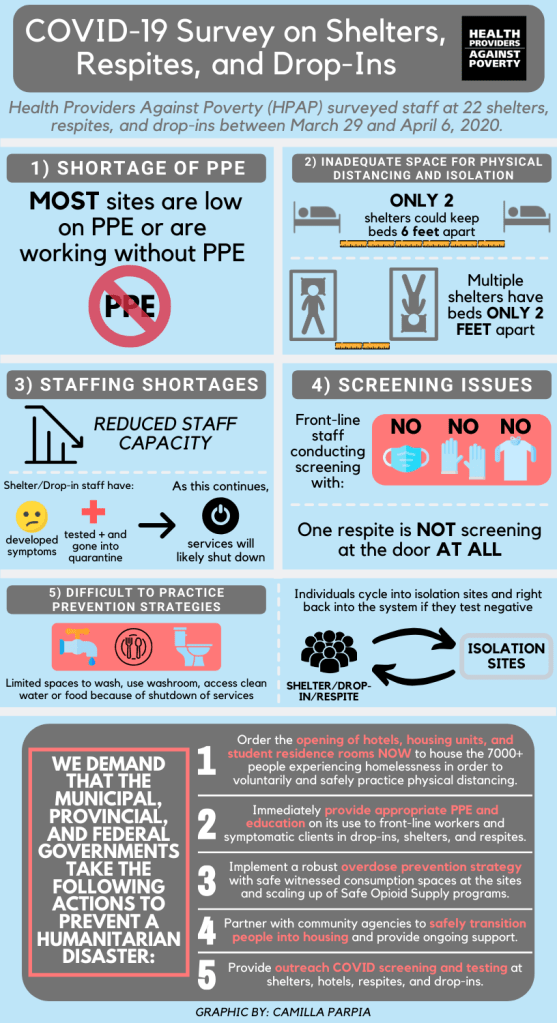 Amidst the COVID-19 pandemic, Health Providers Against Poverty surveyed staff at 22 shelters, respites, and drop-ins between March 29 and April 6, 2020 to determine the impact of the lack of urgent governmental support to adequately protect those experiencing homelessness in Toronto and those who care for them. We found that a catastrophic and widespread outbreak of COVID-19 across the shelter system is inevitable unless action is taken immediately.