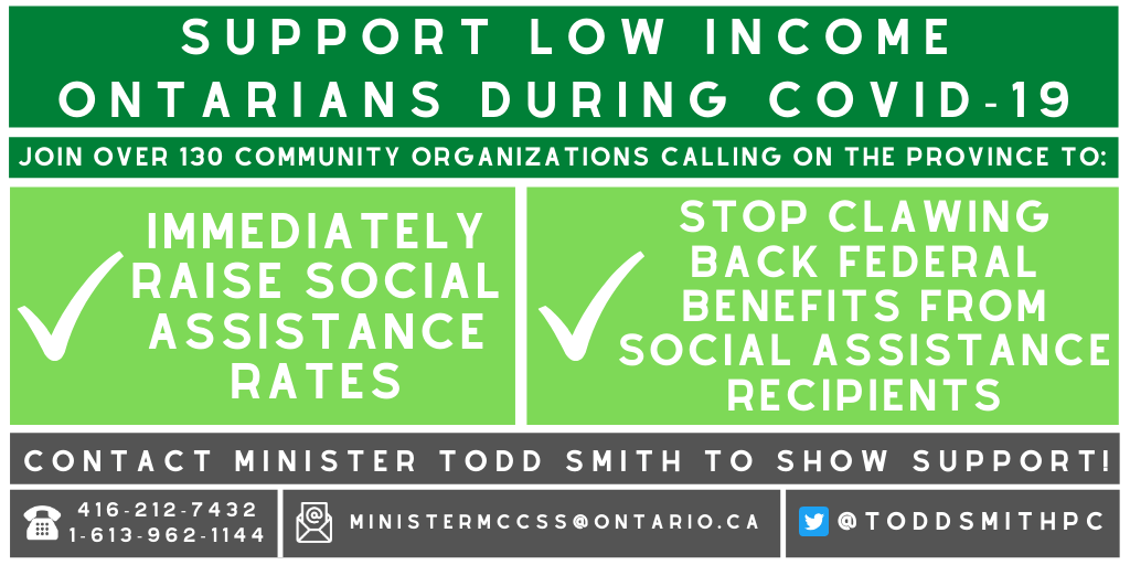 Hi, my name is ______ and I am a ______(social assistance recipient, student, healthcare provider, mother, business owner etc.) in Ontario. I’m calling Minister Smith’s office today to ask him to help to stop the spread of COVID-19 in our communities by raising social assistance rates and stopping the clawbacks on federal income supports for social assistance recipients. If low income Ontarians have enough income to stay safe and healthy during the COVID-19 pandemic, it will protect us all by reducing the spread of COVID-19.